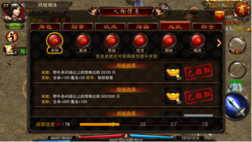 人生四大喜事,久旱逢甘露,他乡遇故知。洞房花烛夜,金榜题名时。出门在外,怎能不干一番大事?《烈火遮天》中,就为玩家设计出了一套独特的成就系统,玩家达到成就所需要的条件,即可在成就系统中领取元宝以及称号等奖励。称号还可以提高玩家生命,攻击,魔防,物防等属性!