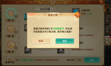 5.1.2:重置天赋将消耗1本【天赋充值书】将全部天赋重置为未分配点数。