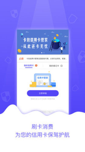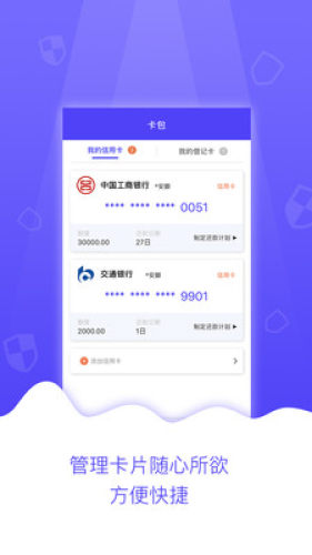 卡包信用卡管家移动端能够智能解析信用卡电子账单,来实现持卡人用卡信息管理和个人财务只能话应用,用户只需要在该产品里输入用卡计划,APP就可以轻松帮您实现账单需求,用户在此过程中可以获得还操作,消费报表,让用户轻松管理信用卡。