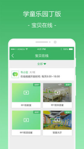 宝贝在线:在线视频监控管理和查看,随时随地掌握各班上课或活动情况;