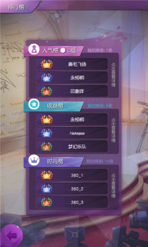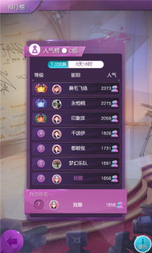 排行榜分为粉丝榜、收益榜、时尚榜三个榜单,玩家可通过左右滑动切换榜单。榜单显示前50名玩家,信息包括:排名、头像、昵称、粉丝数。当玩家在榜单上有可领取奖励时,显示叹号红点提示 。