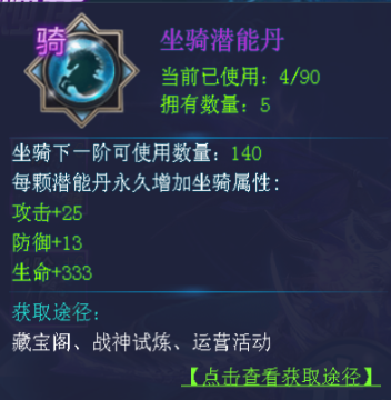 使用坐骑潜能丹可以提升坐骑的固定属性;