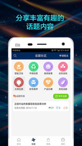 智能家居、牛掰创意、装修故事、有问必答等话题板块,为用户提供一个创意交流、装修分享等的平台。实现信息分享、资源互换,打造一个基于共同爱好的互动交流社区。