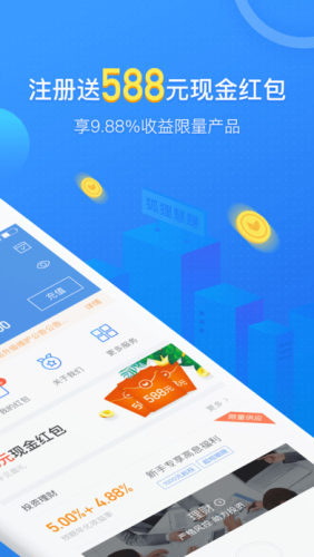 1.新用户注册即送588元现金红包,专享9.88%收益限量产品