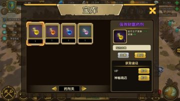 药剂类存放着玩家获得的不同等级和效果的药剂,药剂可以起到加成的效果。药剂主要通过VIP的宝藏系统获得,或者在神秘商店中购买,但是无法出售。等级越高的药剂,药效越长。