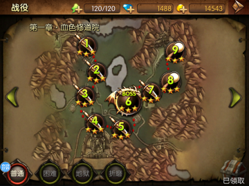 战役分普通、困难、地狱、折磨四个难度,需先通关低难度的章节才可开启更高的难度。