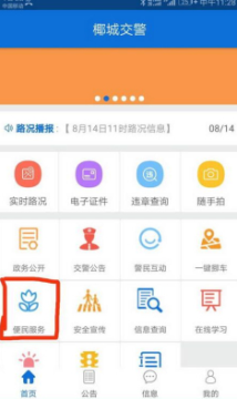 椰城交警App主要包括实时路况、电子证件、便民服务、一键挪车、在线学习、政务公开、交警公告、警民互动、随手拍、交通安全宣传、信息查询、星级用户等11大板块共35项功能。