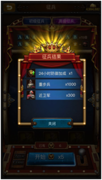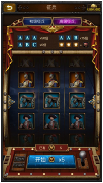 点击征兵建筑,进入征兵界面,征兵分为普通征兵与高级征兵。普通征兵每次消耗1枚征兵徽章,高级征兵每次消耗5枚征兵徽章。点击开始征兵即可转动轮盘,征兵规则与老虎机类似,转动到不同组合会产生不同征兵结果。