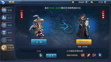 每天固定时间,帮主或副帮主可以召唤BOSS供帮派成员挑战,挑战成功后会有击杀奖励和场景奖励。