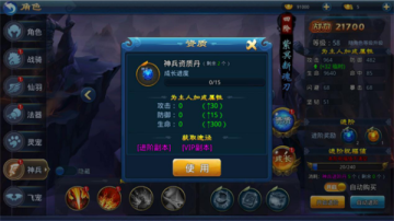 消耗神兵进阶丹可以对神兵进行进阶操作,神兵进阶可以增加神兵属性。消耗进阶丹且进阶失败后,会自动累积祝福值,祝福值越高,下一次进阶成功率越高。