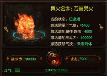 超强的提升巨额战力增加提升战力是激活异火三大提升之一,不论是第一次觉醒异火或是后续的为异火提升等级都可以获得巨额战力的提升。而既然说了是三大提升之一,那么异火激活带来的战力就绝对是对得起“巨额”二字的,玩家激活第一个异火万兽灵火后即可获得60万战力的增加,并且越高级的异火带来的战力增加也就越多。