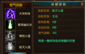 毁灭火莲(主动技能):佛怒火莲的升级版,每次使用会对周围一圈的怪物造成比佛怒火莲更为惨重的伤害,每次使用消耗100点怒气值,无CD时间。