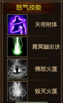 天帝附体(主动技能):每次使用消耗10点怒气值,使用该技能后可使自身下次攻击造成的伤害加深,无CD时间。
