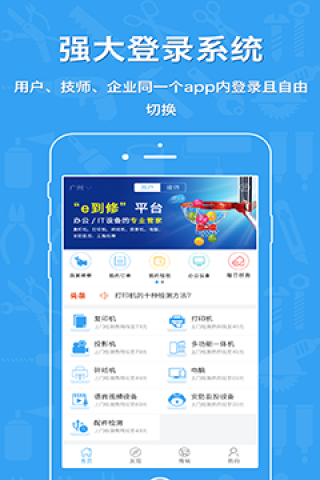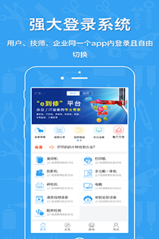 e到修APP为客户提供一种简单快捷的网上办公服务,提供电脑、打印机、复印件等多种办公设备一键叫修服务,网上下单,技师在线接单上门维修,大大的提高了效率!