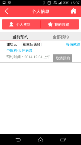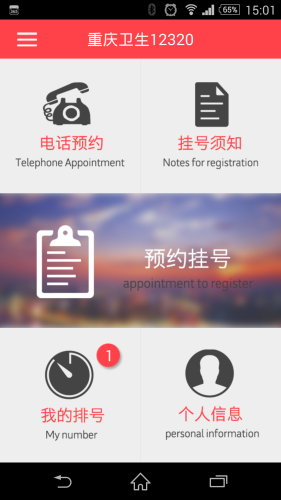 这是重庆市12320卫生热线预约挂号服务官方手机应用,市民安装并打开客户端,可通过点击客户端首页的“预约挂号”查询医院专家信息、坐诊情况,即时进行预约挂号;查询、取消已预约的诊疗号可点击首页“我的排号”;如有任何疑问,可点击“电话预约”拨打卫生热线12320咨询。在数据方面,手机客户端、网站和电话预约保持同步,市民可通过任何一种方式预约或取消诊疗号。之后,手机客户端还将加入一对一专家在线咨询、健康知识查询、在线心理援助、控烟监督等特色公益服务,未来还会推出健康监测与报警系统、智能用药系统、智能健康知识推送等健康辅助功能,变身成为健康助手APP。