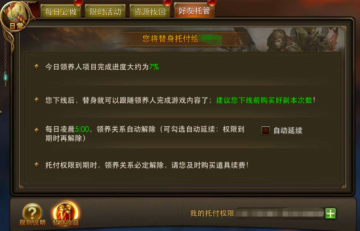 托管人(就是买卡的人):首先你要先买好友托管卡然后使用,使用完毕后就可以选择托付给自己的好友了(记住要托付给平时靠谱很熟的,等级差不多的,然后他的任务都没有做,不然他做完了就没有办法带你做了)。托管完毕后,你就可以安心下线了,然后等好友带着你的替身去做任务了。等你上线后,就可以去替身界面的“替身收益”那去领取活动奖励了(100%奖励,比扫荡好很多)!就是那么轻松愉快!