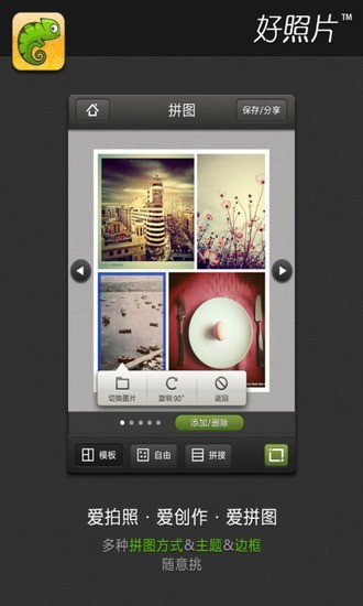 拼图:提供模板拼图、自由拼图、图片拼接三大拼图模式, 同时搭配几十种边框和背景素材