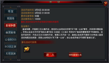 在活动开启前10分钟至皇城争霸开启期间,皇城公会的玩家可以通过点击”进入”按钮传送到皇宫,其他玩家只能活动开启时才可进入。