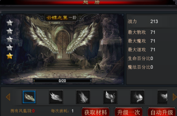 目前翅膀共有10阶,每阶翅膀等级分四星,共四个小等级,消耗“凤凰羽”能够增加经验条经验。每次升星和进阶均可获得大量属性。