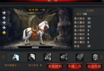 坐骑目前一共有9阶,每阶分4星,升星满后就会自动进阶。每次升星和进阶均可获得大量属性。