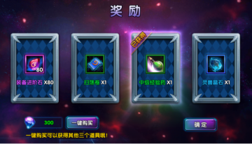 通关珍宝洞窟副本后也会出现四个牌子,每个牌子对应一种资源(包括各类高级材料、技能书、英雄元魂、各种宝箱等稀有材料),玩家可选择任意一个牌子打开,获得其对应的资源,也可以消耗300钻石一键购买。