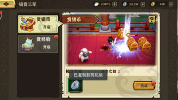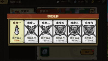 4.赏银币在周一、三、五、日开放,而赏经验则是在周二、四、六、日开放。根据战力的不同有多种的挑战难度,难度越高,所获得的银币奖励也越高