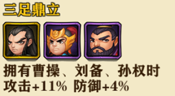 三足鼎立 拥有曹操、刘备、孙权时,攻击+11%,防御+4%