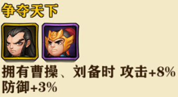 争夺天下 拥有曹操、刘备时,攻击+8%,防御+3%