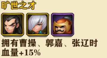 旷世之才 拥有曹操、郭嘉、张辽时,血量+15%
