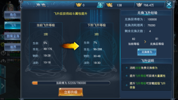 等到玩家等级大于八十级以后,就可以消耗已有的经验兑换修为,用修为来升级飞升,飞升后获得生命、攻击、物防、法防属性提升,同时提升飞升等级可以穿戴超强飞升装备,属性更加强大。