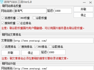游淘气站长工具,一款非常优秀的站长软件。在里面可以让每个用户都获得一键进行刷外链和权重,帮助你网站得到搜索引擎青睐。