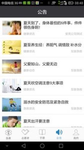 3.急救手册,方便您随时查阅学习急救知识;求助功能,方便浏览地图,了解自己所处的具体位置,在紧急情况下,可以快速向亲友发出求助信号;公告功能,每天向您提供急救、保健类知识。未来增加医疗咨询和问诊等服务。