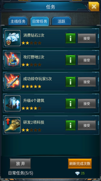日常任务每天有五次机会,需要先领取再进行,小编最为推荐的就是攻打野地和升级建筑,这两个比较容易完成,值得主要注意的是攻打野地的时候尽量的选择比自己等级的低的野地,不然舰队损失较大维修时会消耗较多的可燃冰。当然对于RMB玩家小编首推的就消费砖石任务,不为什么,有钱任就是性!