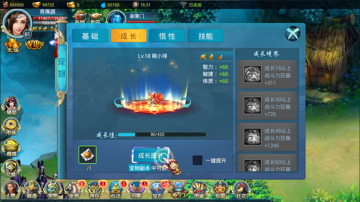 成长:角色15级开启宠物成长,提升成长可以获得大量属性加成,每天都可以免费提升1次成长;成长达到一定条件还可以激活成长境界:元阶、玄阶、人阶、地阶、天阶,每达到一定阶段,都可以获得额外加成