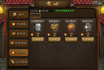 主公35级可进入宝物商城,宝物商城每日从掉落表中随机抽取宝物出售,宝物商城中的货物共享当前商城折扣,商城折扣每日折扣为1折,随着购买次数增多,折扣数也逐渐上升,消耗铜钱可手动刷新货物,但不会影响到商城折扣。