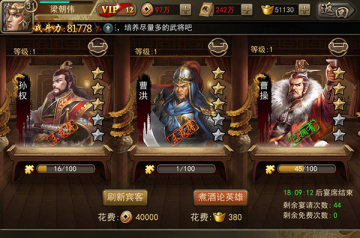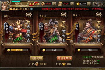 系统会随机抽取3名武将(已经获得的武将或者获得的碎片)到客栈中,主公可刷新武将,刷新后将显示新的武将。