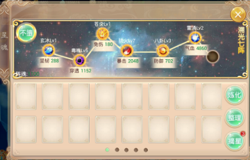 1.摘星:使用铜钱或元宝进行抽卡,至多可装配13种不同阵法卡,每种卡牌最高升至7级。