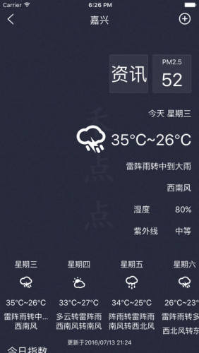 点击功能列表中的“天气”按钮,立刻掌握嘉兴的天气情况。