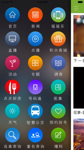 点击功能列表中的“直播”按钮,选择想听的广播就能实时收听嘉兴各个频率的广播节目,选择想看的电视就能实时收看嘉兴电视台的各个节目。