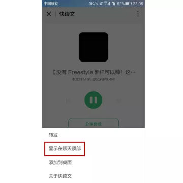 不过,略感遗憾的是,没有提供「进度条自由调整」和「回放文章」的功能,当你想要听一下文章的某些部分内容,就需要重头听起,也是很抓狂。如果想要边看文章边听音频怎么办?跟所有音乐类小程序一样,只需将其「显示在聊天顶部」,就可以实现后台播放和边看边听了,让你更高效地充实自己