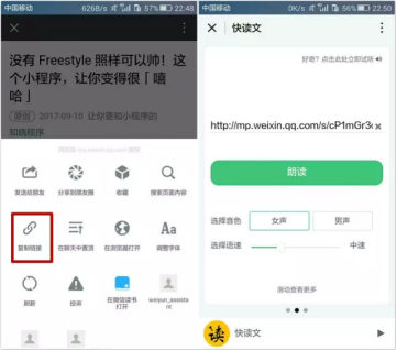 这款快读文微信小程序,用户只需要将某篇文章的链接粘贴解析后,即可用语音的方式朗读出来,而且你还能选择女声或男声以及语音的播放速度等。