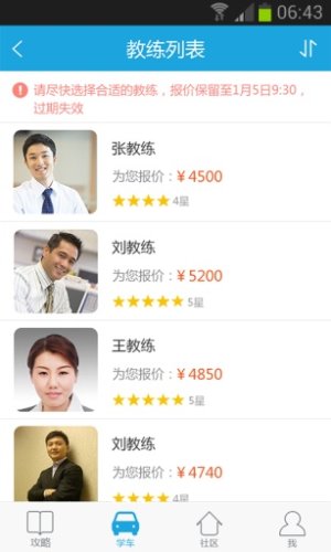 学员轻触指尖发布学车需求,海量教练极速在线提供报价轻松比价让学费更低!