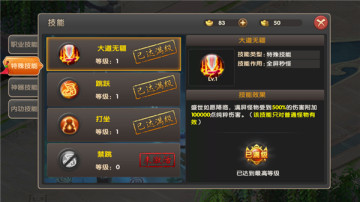 2.特殊技能包括心法技能、跳跃技能、打坐技能。