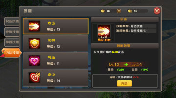 2.内功技能一共有7种,分别为:攻击、防御、气血、命中、闪避、暴击、坚韧。