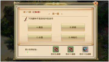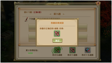 答题内容大多是比较简单,只要大家多熟悉一下我们的游戏及文化、生活常识,就可以答对了。每日答题一共是15题,答对的题目越多,经验奖励与宝物奖励也相应的数倍升高!