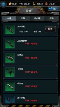 玩家可以通过城市内的军械厂建筑进入装备制作界面,对装备进行属性查看或打造,目前进行打造是玩家在游戏内获取装备的唯一方式,但需要消耗一定数量的材料和资源,资源消耗主要为弹药,可以通过城市内的军火库活动,长辈材料需要通关指定副本战斗才可获得。