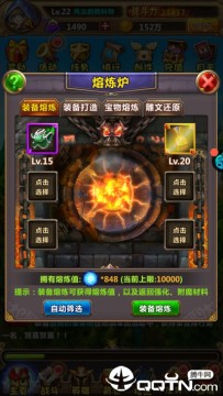 熔炼值可以用来打造装备,可以打造出比同等级、同品质属性更高的装备,最低也是紫装。终于,不用充钱也能搞到好装备了……要注意的是,打造出来的装备等级是和玩家当前的挂机副本等级相关的。所以,骚年,先去把副本推平了吧!