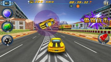 在游戏中还可以发射“流星飞弹”,攻击前方敌人,命中时令其在原地停滞一段时间。使用技巧:在飞弹射程之内再发射,注意敌人的护盾。“霹雳暴雷”,向后发射地雷,阻止后方敌人。使用技巧:超过敌人车辆之后,立刻发射地雷,可保证高命中率。“钢铁壁垒”,持续期间内无视敌人一切攻击。使用技巧:在‘被敌人瞄准’的准星出现之后及时释放;在接近终点是释放。“风驰电测”开启夜氮加速系统,瞬间爆发出强大的速度。使用方法:冷却时间一到立刻使用;被敌人击中后使用,可抵消停滞效果。“雷霆万钧”使用道具后,所有敌方车辆被困在天空中,无法进行任何动作,持续时间5秒。操作简单,容易上手,喜欢玩赛车的朋友你们还等什么呢?赶紧下载来体验速度与激情吧!!!