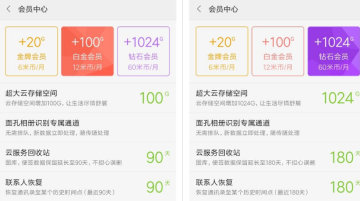 小米云服务还为用户提供了白金会员和钻石会员两种服务。两种会员都具备手机每天备份和PC端云助手的功能,不同的是,白金会员可增加云存储空间100G,云服务回收站和联系人恢复可达90天;钻石会员可增加1024G云存储空间,云服务回收站和联系人恢复可达180天(半年)。资费方面,白金会员为12米币/月,钻石会员为60米币/月。