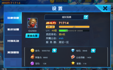 设置系统,包括玩家信息和系统设置等功能,玩家可以根据自己想要进行设置(声音,音效的开启),兑换礼包等还有会让属性得到加成的英雄图签。